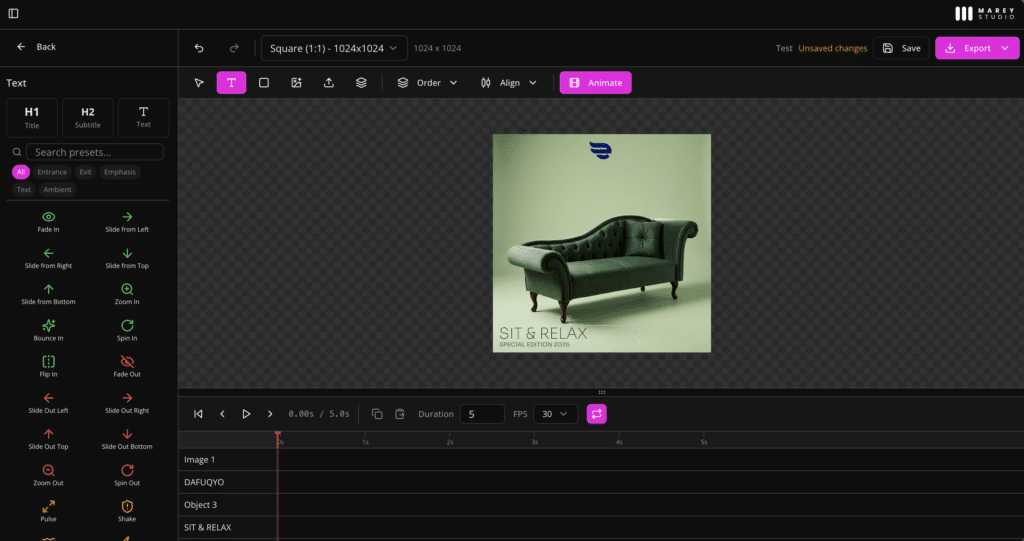 Most AI image tools stop at the image. You get a beautiful product scene, you download it, and then, if you need to add your logo, a promotional text overlay, a branded frame, or an animated version for Reels, you open something else. Marey Studio doesn’t stop at the image. It gives you a full design editor and an animation studio, both built directly into the platform.