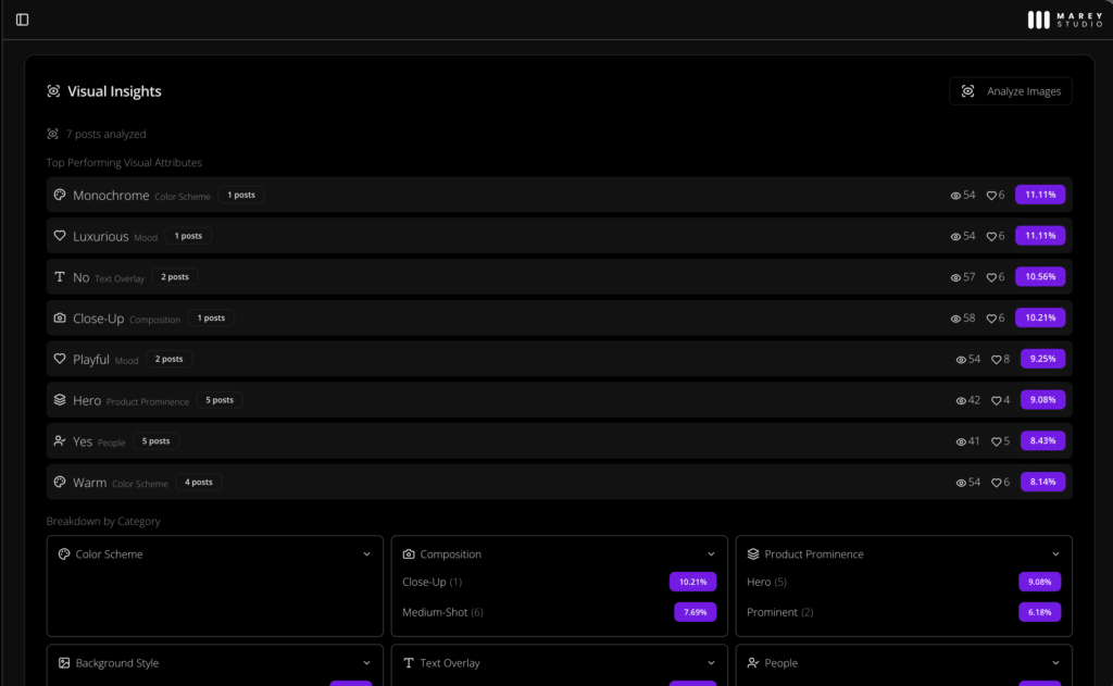 After publishing, Marey Studio tracks performance across platforms. The analytics layer surfaces which visual styles, formats, and posting patterns drive the most engagement for your specific audience — and feeds those learnings back into future generation decisions.